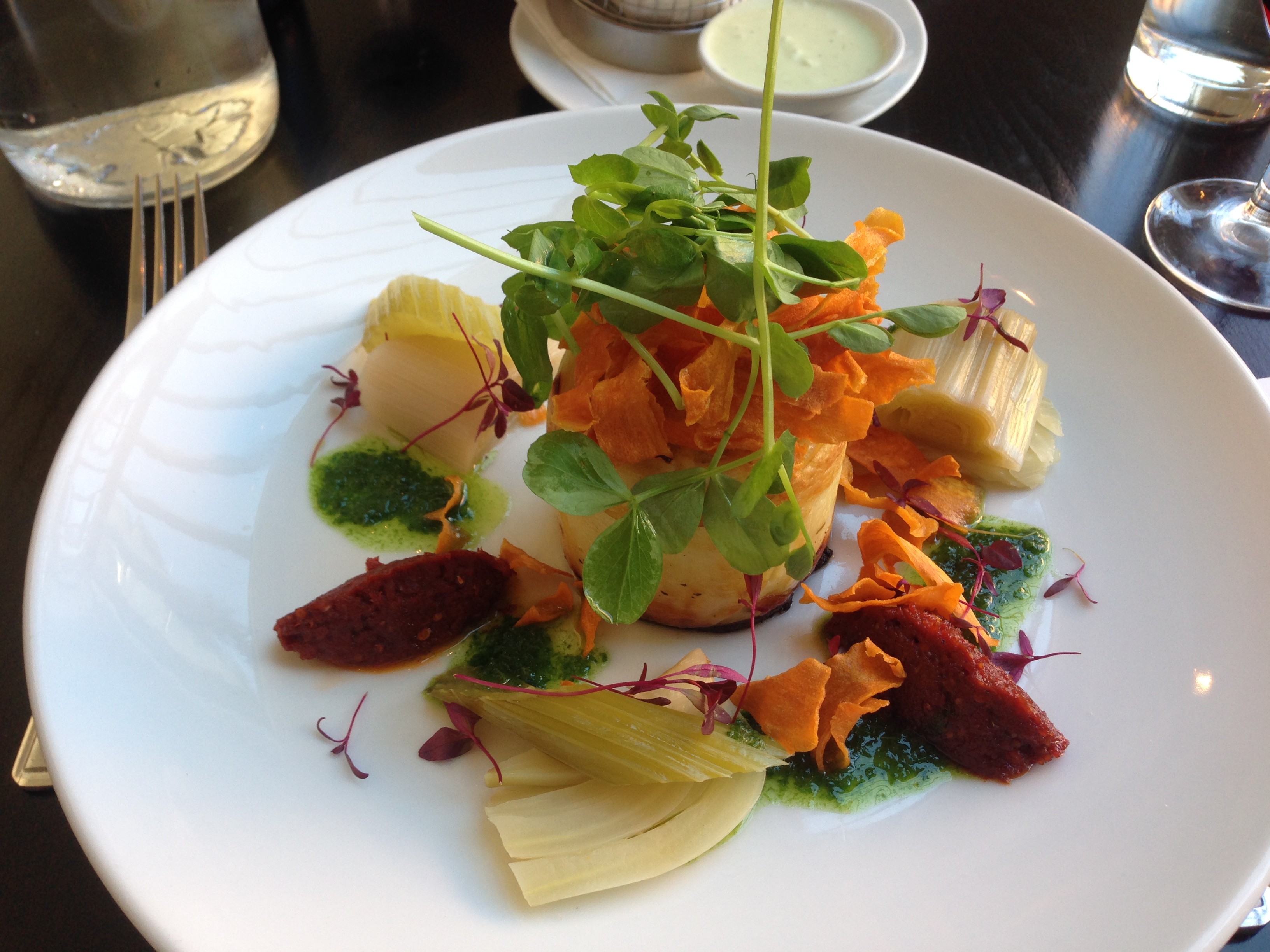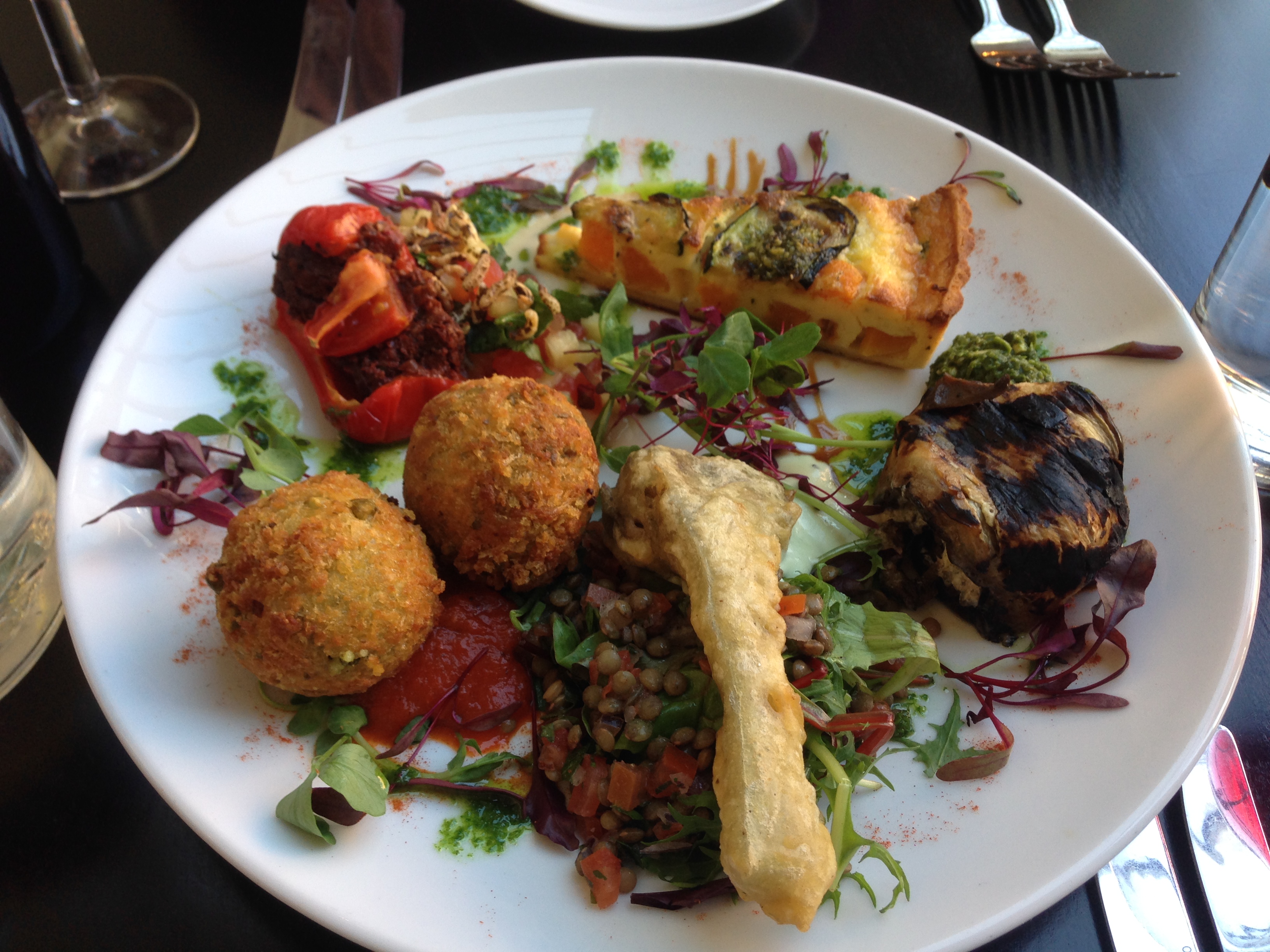 My guest and I started with the Mezze Platter which consists of a selection of the starters and included the Feta and Cous Cous Fritters, Aubergine Charlotte, Piedmont Pepper, The Griddled Courgette, butternut, cashew & pesto Tart and the Carciofini (artichoke). Each and every item was as tasty as the other. The fritters were extremely light and crunchy. The pepper was fresh, delicate and flavourful. The tart gave you a sense of being at home and was an absolute piece of heavenly comfort food. I had never tasted artichoke before but was very tasty, was cooked to wonderfully and complimented perfectly with lentils. Finally the aubergine isn’t something I would normally have ordered but again it was cooked perfectly and accentuated with the pesto, tapenade and sides. The great thing was that for two people it was perfect as everything was really light and left your mouth watering in anticipation for the main meals.