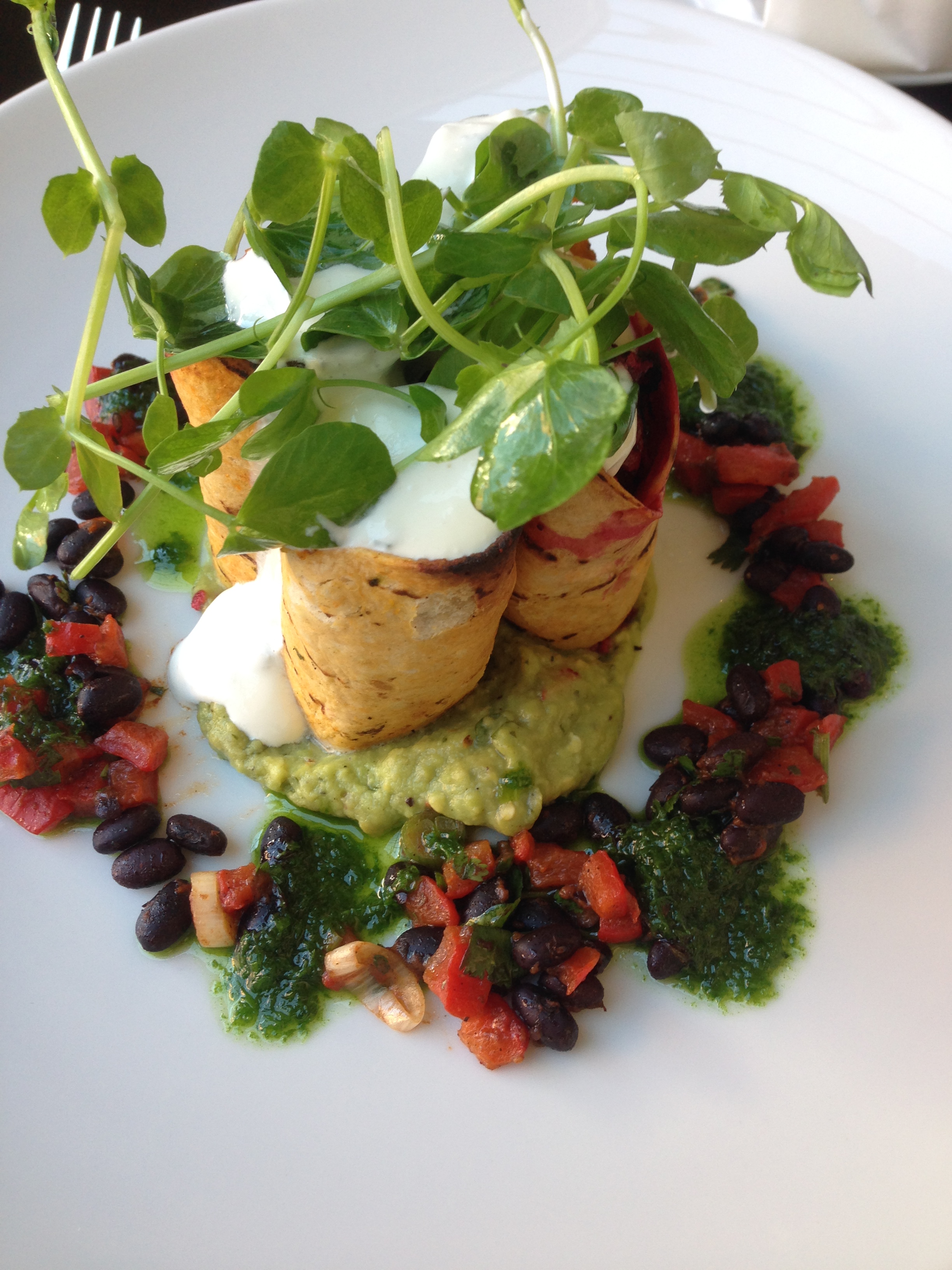 For our mains I opted for the Cauliflower and Emmental glazed Rotolo which was a Romanesco and white cauliflower rolled in a thyme infused potato, baked and glazed on braised fennel, celery and leeks with a sundried tomato pesto. My guest ordered the Tortillas and came with Sweet potato, sweetcorn, goats cheese, chilli, lime and coriander. Baked beetroot, feta, parsley, guacamole, sour cream and black bean pepper salsa.