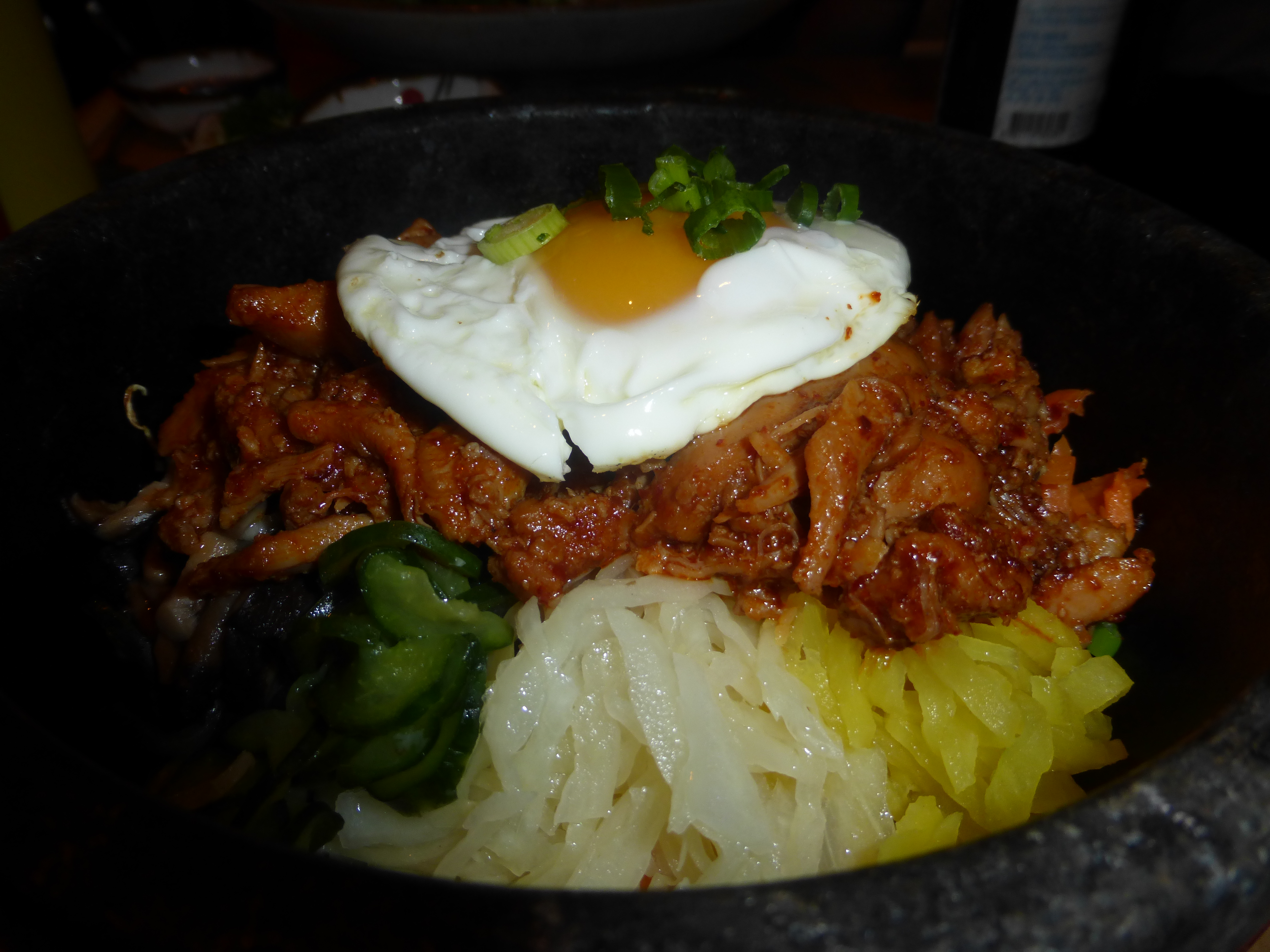 I had the Chilli Chicken Bibimbap which was like a hot pot and was served in a hot bowl and on a hot dish. The dish lived up to its name was hot, spicy, more-ish and again very well-seasoned. Traditionally the dish is served with a fried egg, which I opted for and that added to the complexity of the dish and its flavours.