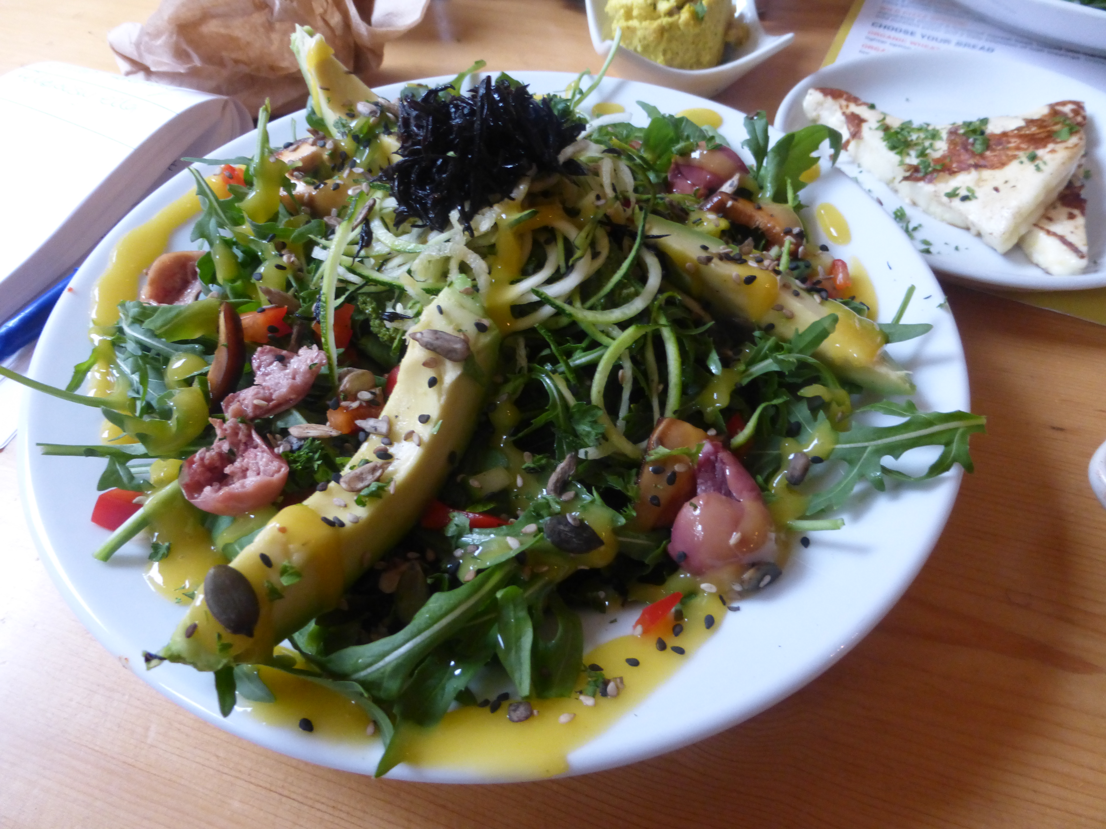 The next thing I would highly recommend is the Ayurvedic salad served on a bed or organic lamb lettuce, wild rocket topped, amaranth, courghetti spaghetti, hijiki seaweed, slices of artichoke hearts, avocado, cucumber, red pepper cubes, finished off with coriander, rocket & parsely pesto, mango salsa, activated savoury seeds flavoured with leafy greens and spices, and marinated shitake mushrooms.