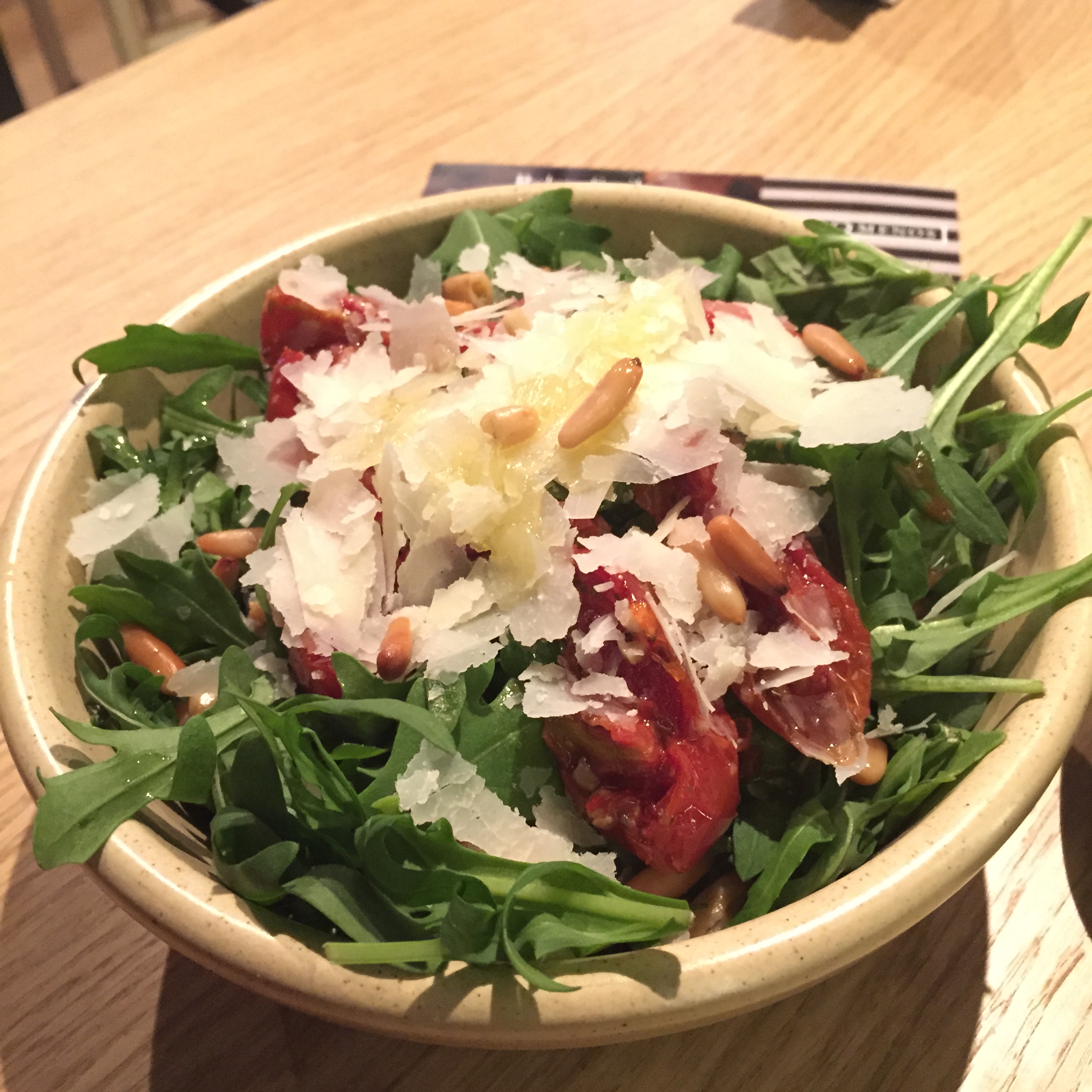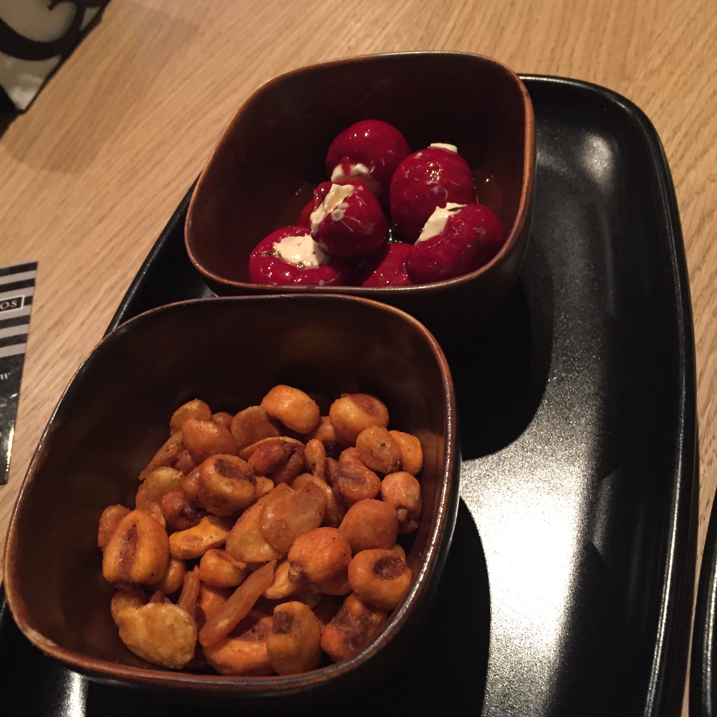 Bina and I decided to order a selection of tapas so we started with some tiny baby olives. These had little stones in with a strong taste, they were fresh and slightly seasoned. Along with the tapas we ordered a rocket salad which included pine nuts and a balsamic dressing. These starters were served with yummy, moreish corn nuts.