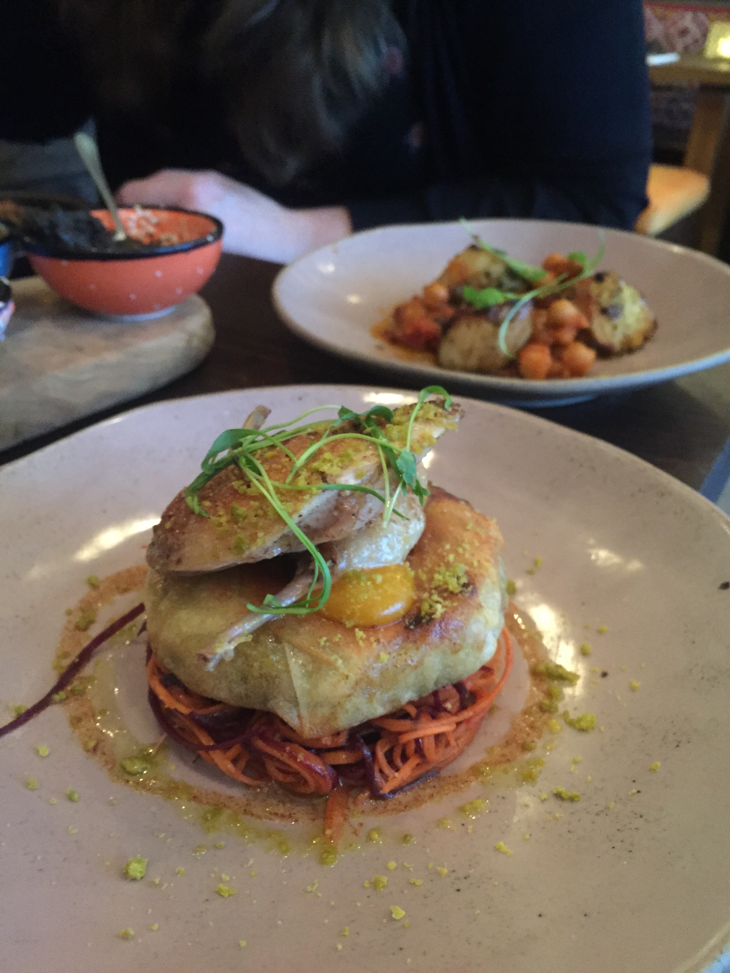 We followed the platter with our starters. First of all we had the pan-fried scallop chermoula which was cooked with chickpea, tomato and cumin. It was delicately flavoured, melt in your mouth, light, tender and heavenly. This was a really unique twist in way that a scallop is cooked, as this was the first time I’ve eaten scallops and chick peas together and it really worked! The second starter was the quail pastila and that was served with carrot and sultana slaw with a mango and orange blossom dressing. This was sweet, crunchy and a great contrast with the quail and slaw because when you took a bite there was an explosion of flavours!