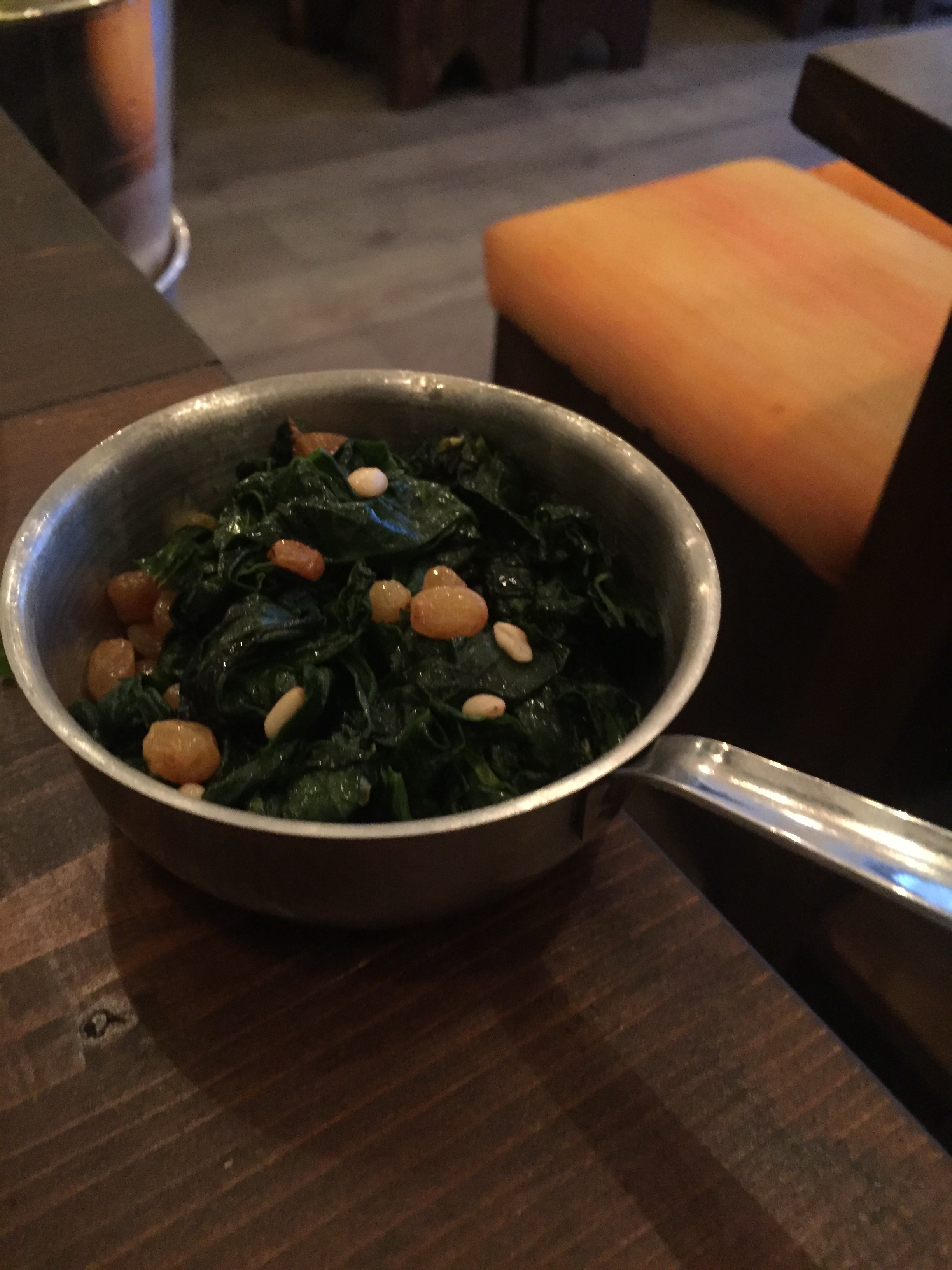Moving on to mains, we shared the sea bass en papillotte and poussin tanginess served with braised fennel and green olives. On the side we had quinoa and spinach which perfectly complemented both dishes. The poussin was sensationally tender, and the flavours were delicate and didn’t over-power. The sea bass was excellent! It was covered so we didn’t have to see the fish’s face (hehe) and was tender, fresh and flaky. It was served with lots of lovely onions and peppers, along with a harissa sauce with was spicy and tangy but very moreish!